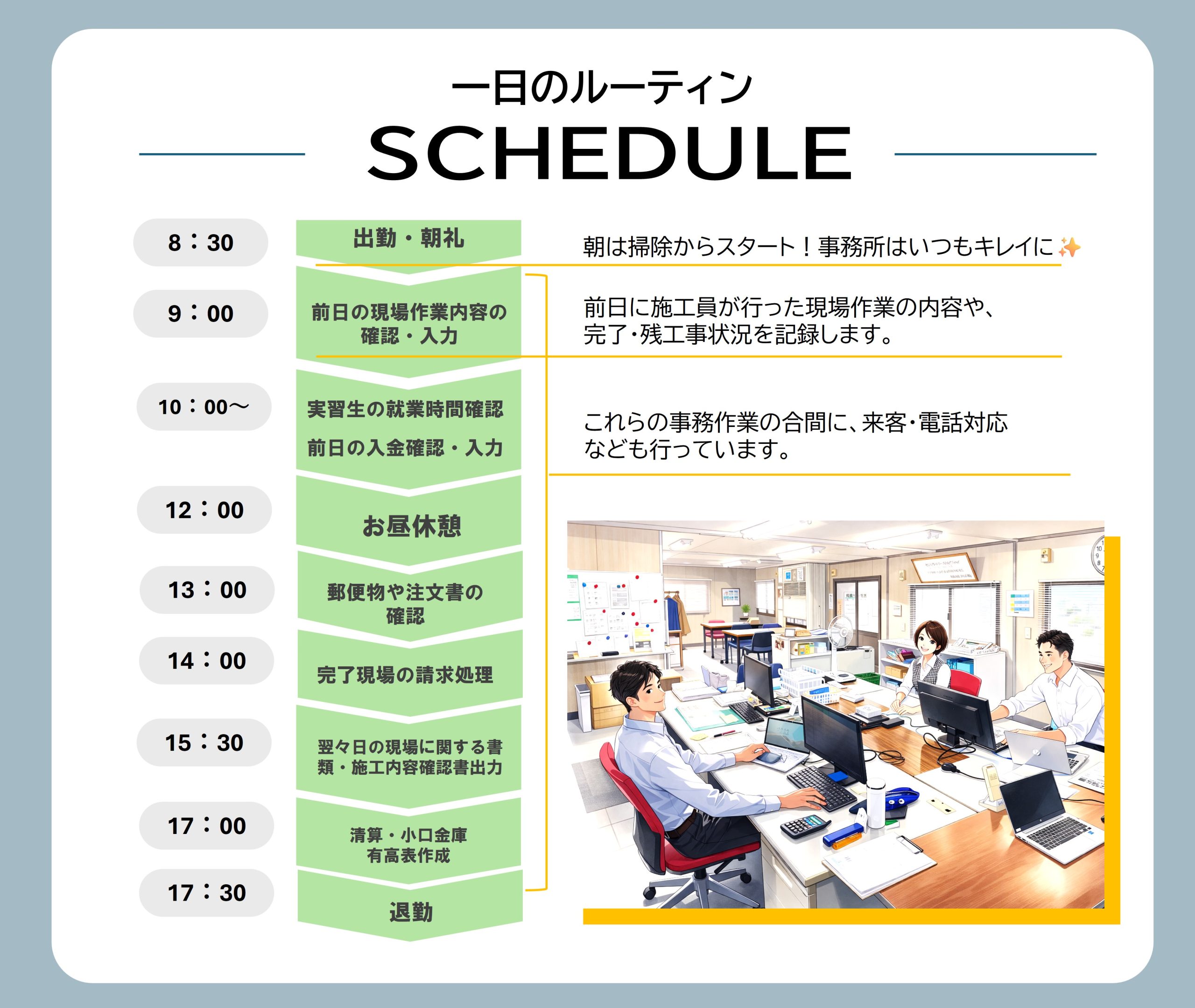 事務の仕事は本当に多岐にわたります。入金確認や請求書作成、小口金庫管理などを行う経理事務。施工員の日々の現場の作業内容確認・入力、実習生の就業時間確認などを行う労務。他にも施工に必要な書類を確認・準備したり、郵便局や銀行への支払業務・その他申請書関係や安全書類作成・車両にかかわる業務などを1人で行っています。