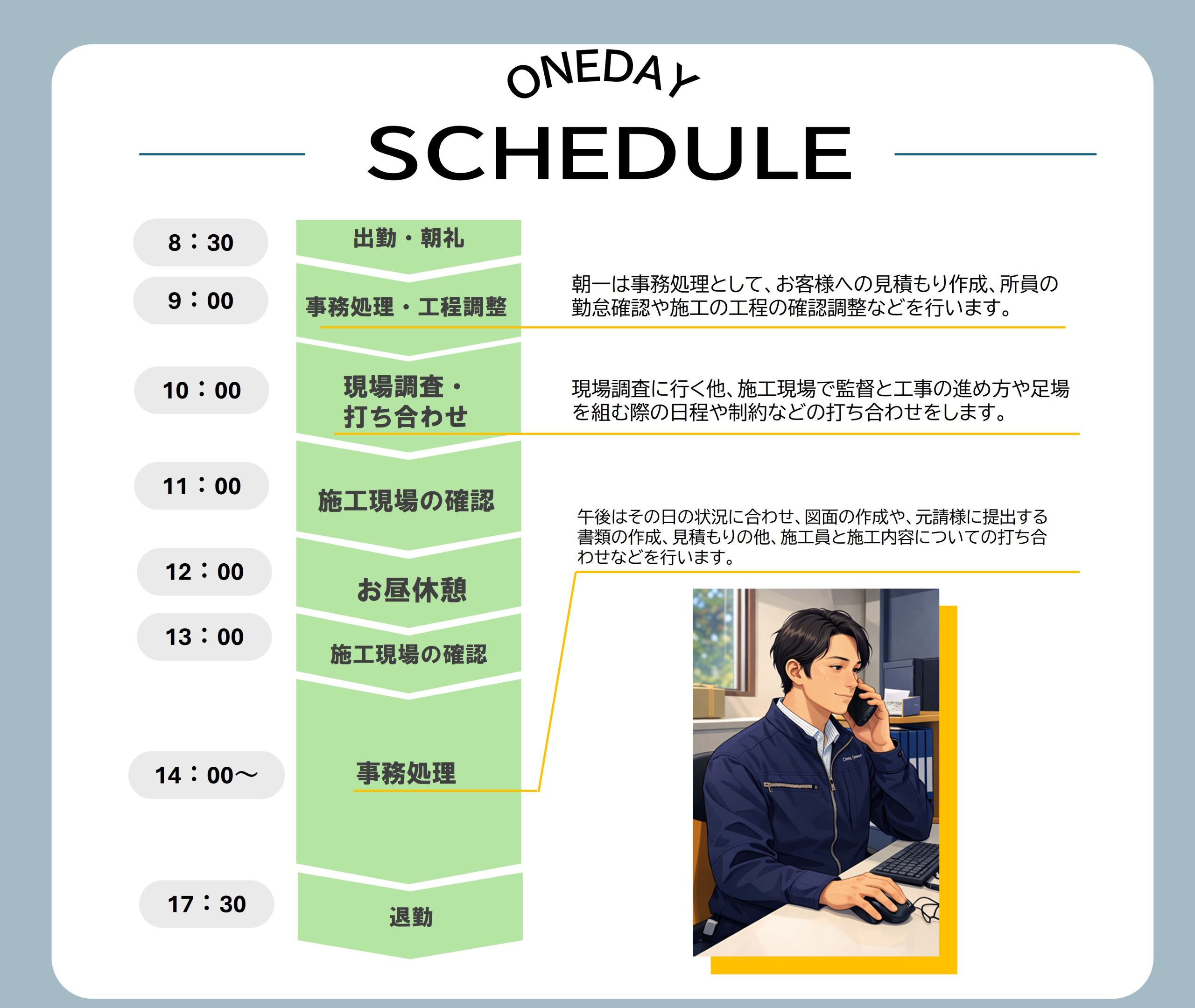 また管理者として、部下の育成、所員の労務管理、各種申請の承認、現場パトロール、応募者の面接など、営業所全体を見る役割も担っています。