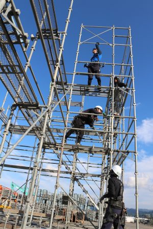現場で鍛えられた技術をフルに発揮し、組立役と中継役に分かれ、手分けして足場を組み上げます。